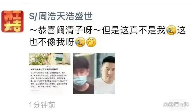 不过后来天浩的老板周浩辟谣自己并非是其男友。周浩发博称:~恭喜阚清子呀~但是这真不是我,这也不像我呀”。周浩否认是阚清子男友,说实话,阚清子的未婚夫和周浩体型上有点像,但长相完全不一样,看来是乌龙事件。